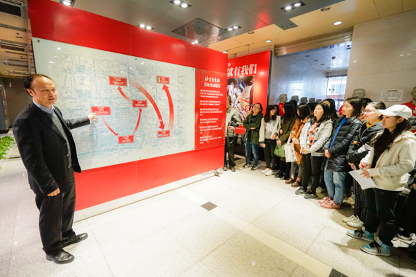 师生参观北京青年报社展厅,张延平社长为学生介绍报社发展史