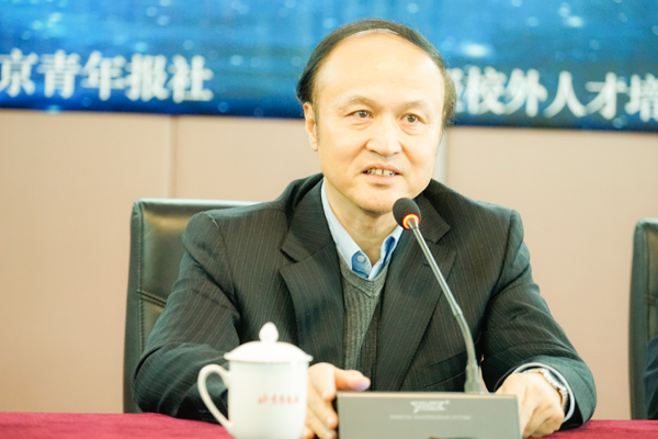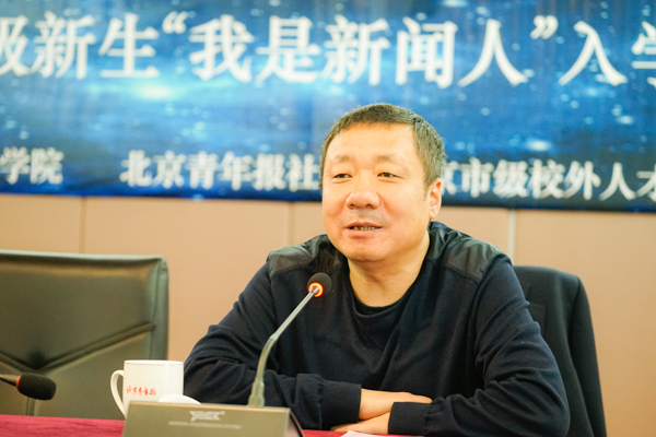 仪式上,首先由北青报社社长张延平讲话。张社长对时代与媒体行业的结合有着自己的特殊理解。他说,作为新闻工作者最大的意义就是它能使你把人生扩展到整个世界,这是其他行当都不能比的。他对新闻业的前景也做出了前瞻性的预估。传统大型媒体集团作为党政机关的媒体机构,具有其他互联网新媒体所不具备的优势,未来传媒的发展方向一定是一个整合趋势。张社长也表达了自己对内容和平台的理解。他说,一个优秀的采访内容必然要依靠一个优秀的平台去传播。采访内容是十分重要的,这就要求记者要有求真求实不怕吃苦的精神。他举了许多记者暗访的真实事例向同学们阐述了作为一名优秀新闻工作者的艰辛和价值。